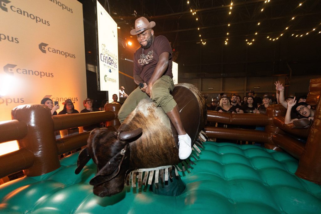 Nada foi aleatório. Chapéus customizáveis, ativações instagramáveis com alma, miniestúdio de reels em clima de clipe sertanejo, touro mecânico com câmera POV, ranking no telão, mural de mensagens para o novo ano.